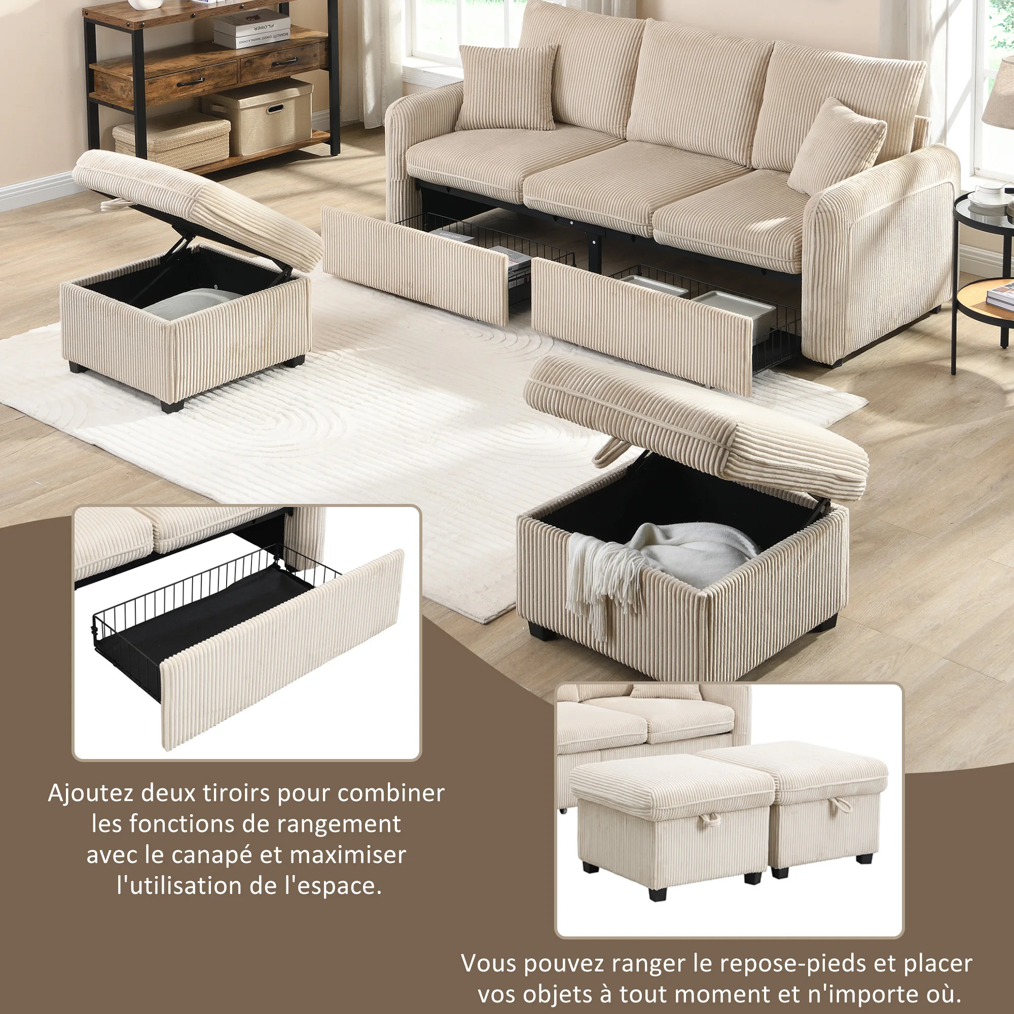 Optimisez chaque recoin grâce aux solutions de rangement intégrées. Les deux poufs sont dotés de compartiments spacieux, et sous l’assise principale se cachent deux tiroirs métalliques robustes. Idéal pour dissimuler télécommandes, livres, plaids ou jouets, ce canapé vous aide à maintenir un environnement ordonné et serein.
