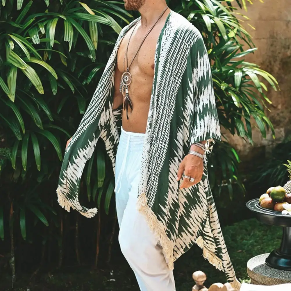 Exprimez votre style unique avec cette cape poncho homme à imprimé géométrique et franges, conçue pour un look moderne et une polyvalence inégalée à la plage comme en ville.