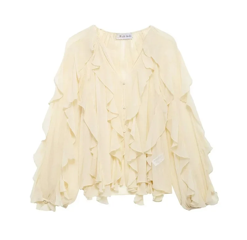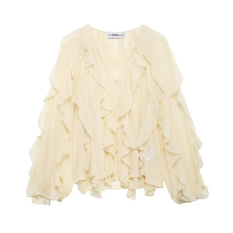 Ce chemisier capture l’essence de la mode contemporaine avec son design épuré et ses lignes fluides. Le col en V flatteur allonge la silhouette, tandis que les manches longues offrent une élégance intemporelle, parfaite pour les journées plus fraîches ou une protection solaire légère. Il est conçu pour s’adapter à diverses morphologies, garantissant un ajustement confortable et stylé.
