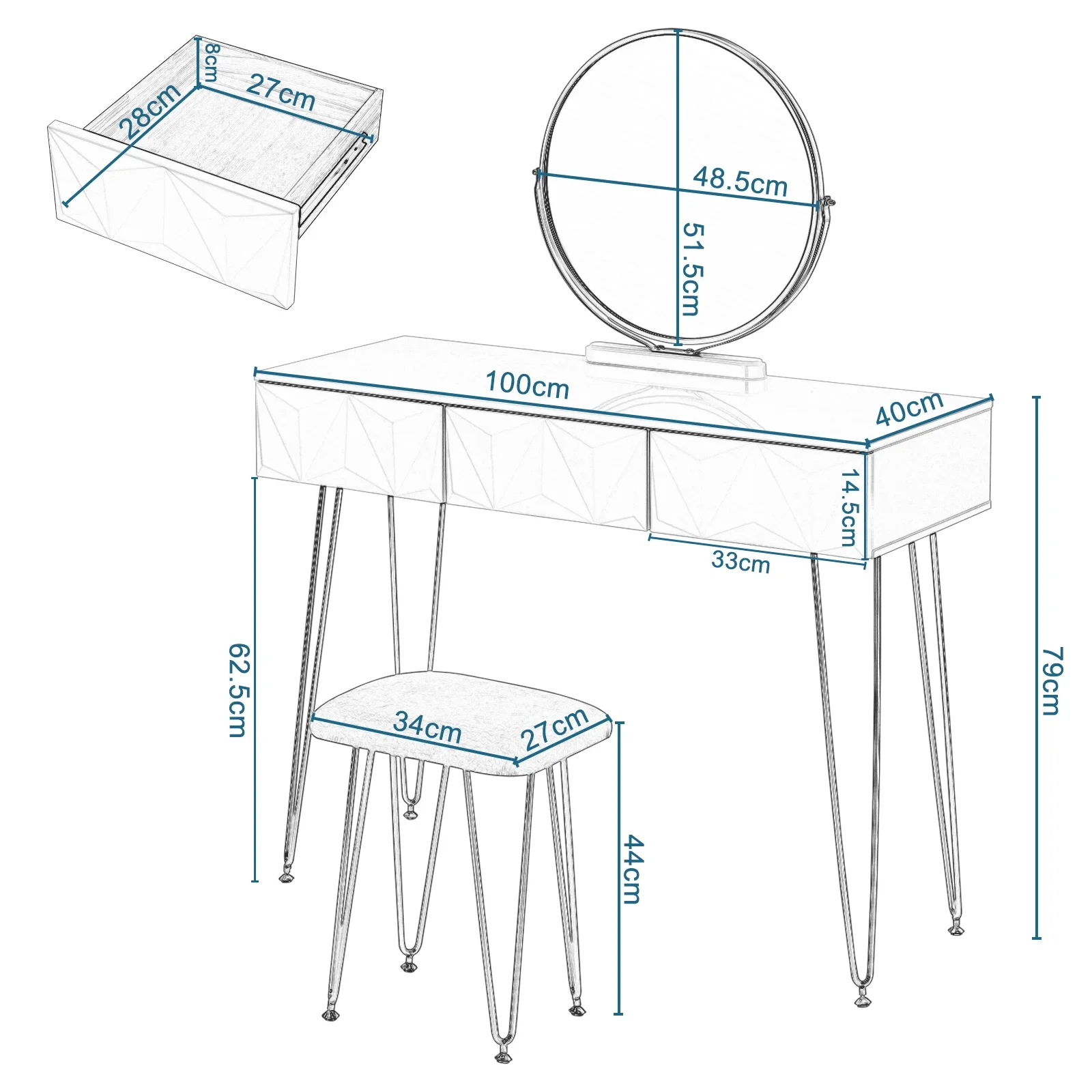- Usage Polyvalent : Sert de coiffeuse ou de bureau élégant.