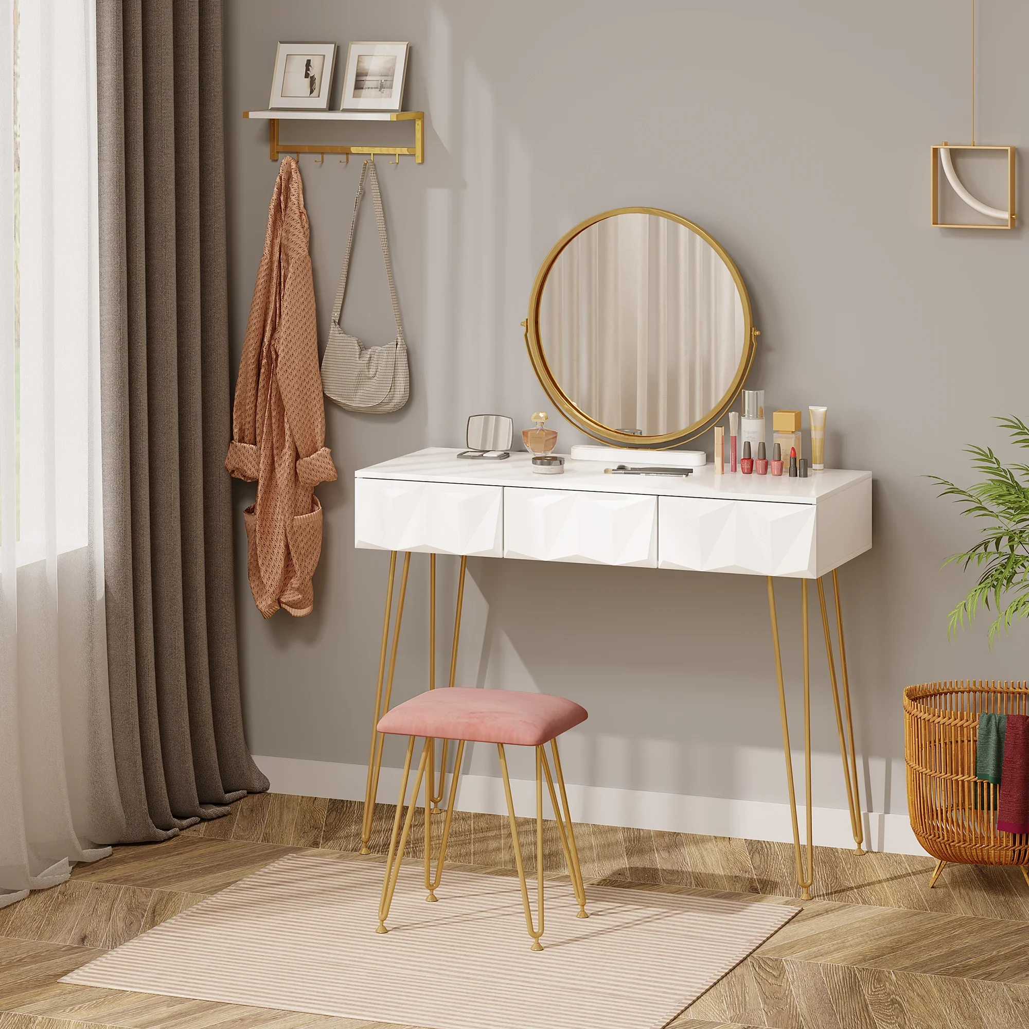 Coiffeuse Blanche Miroir Pivotant & Tabouret Doré – Rangement ChambreCoiffeuse Blanche Miroir Pivotant & Tabouret Doré – Rangement Chambre