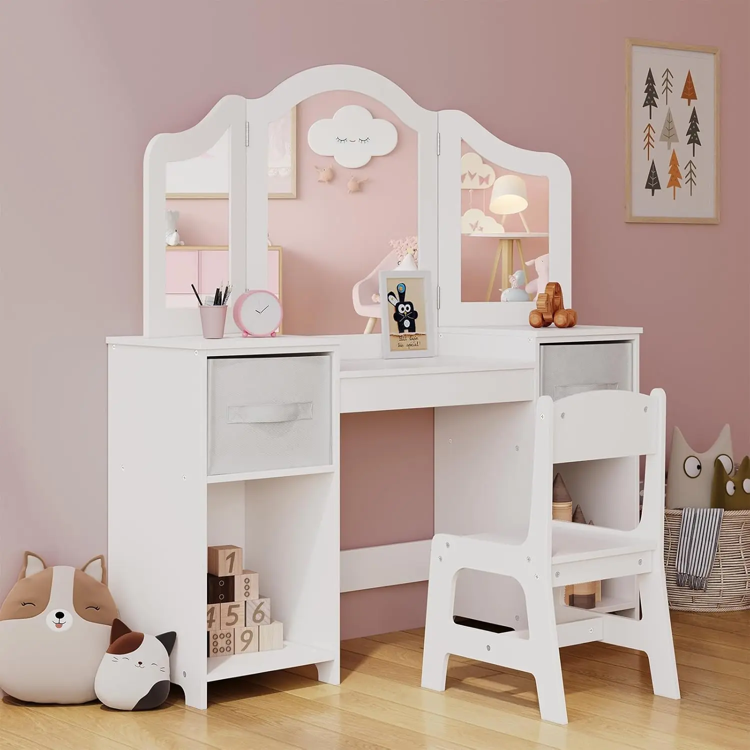 Finis les accessoires éparpillés ! Notre coiffeuse est équipée de deux étagères ouvertes et de deux bacs de rangement en tissu amovibles. Cet espace généreux permet aux enfants d’organiser leurs « trésors de beauté », leurs bijoux fantaisie et leurs jouets préférés, encourageant ainsi l’autonomie et le sens de l’ordre dès le plus jeune âge.