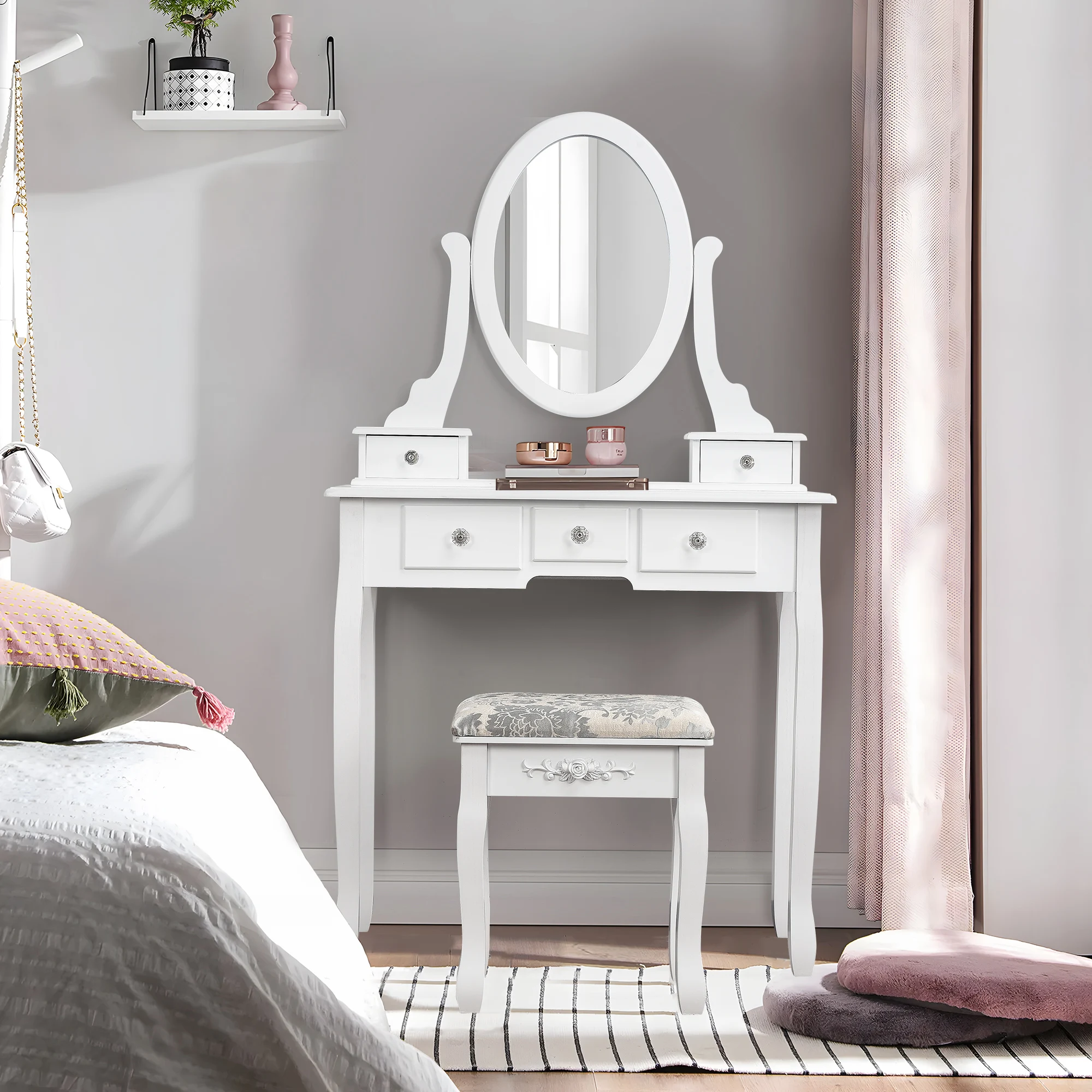 Coiffeuse Miroir Triple & Tabouret Rembourré – Rangement Maquillage Moderne