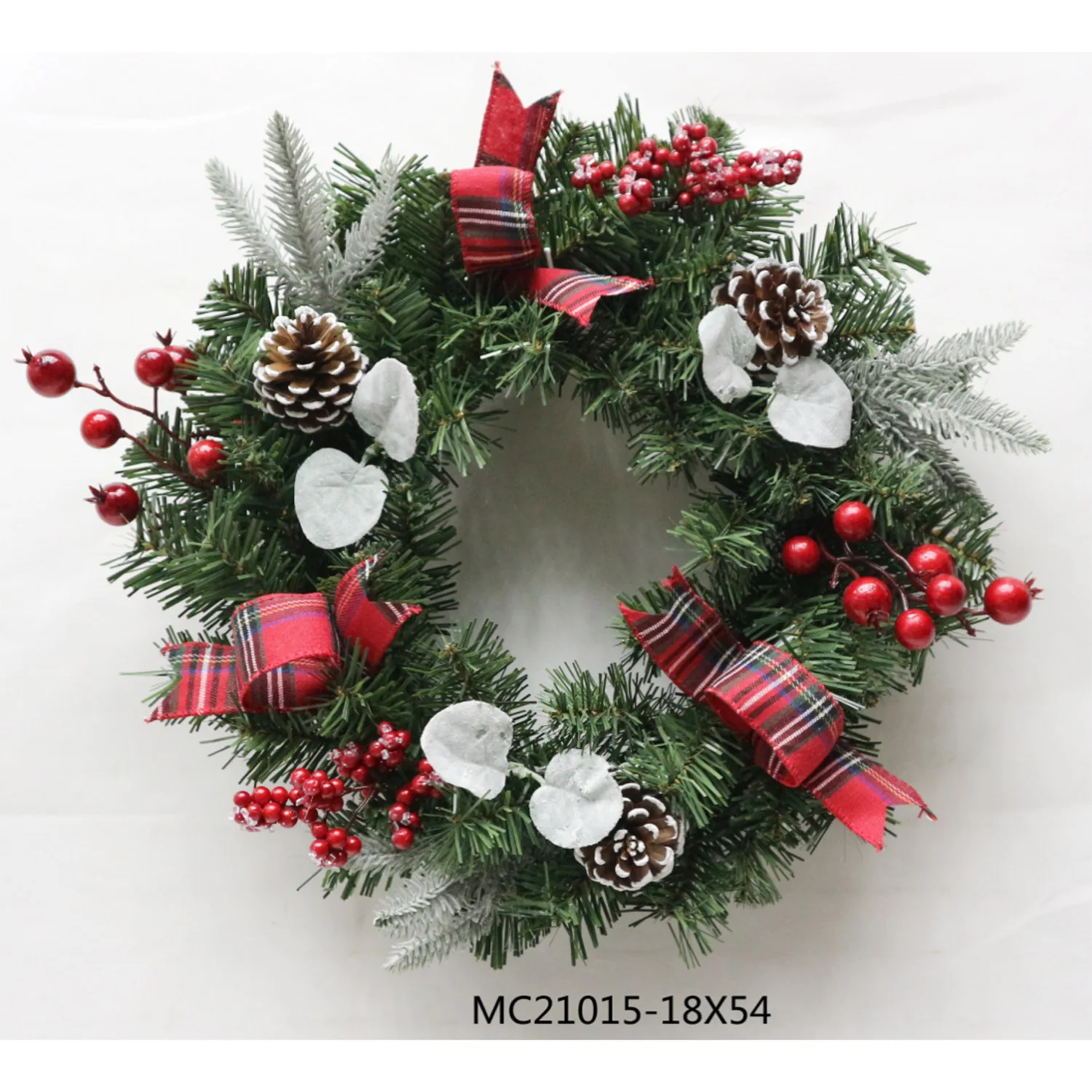 Chaque couronne est richement décorée de baies rouges vives et de pommes de pin réalistes, entrelacées dans un feuillage vert luxuriant. Ces éléments soigneusement choisis apportent une authenticité et une élégance intemporelle, capturant l’esprit traditionnel de Noël.