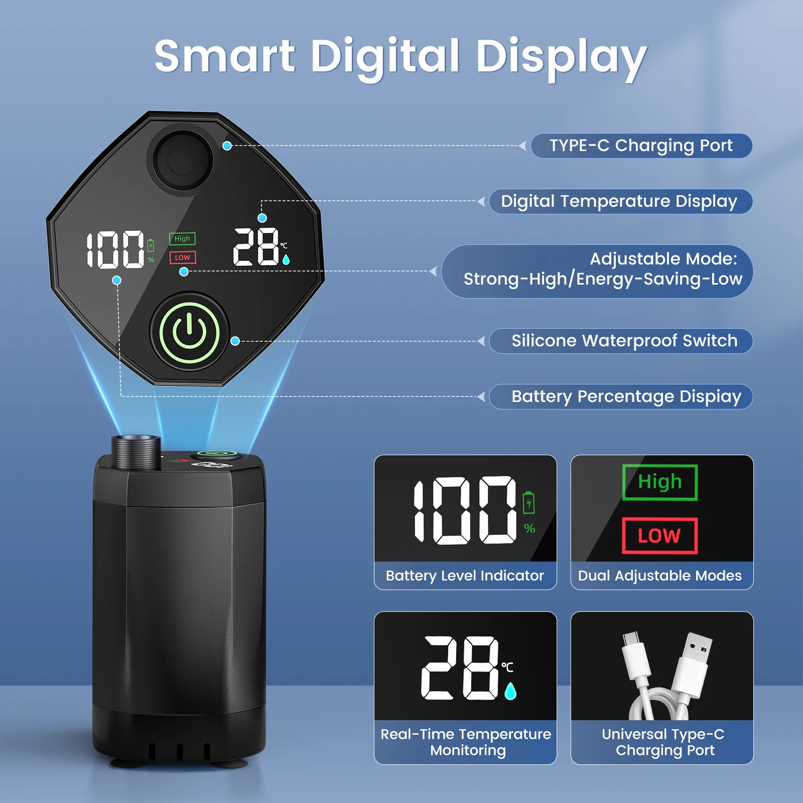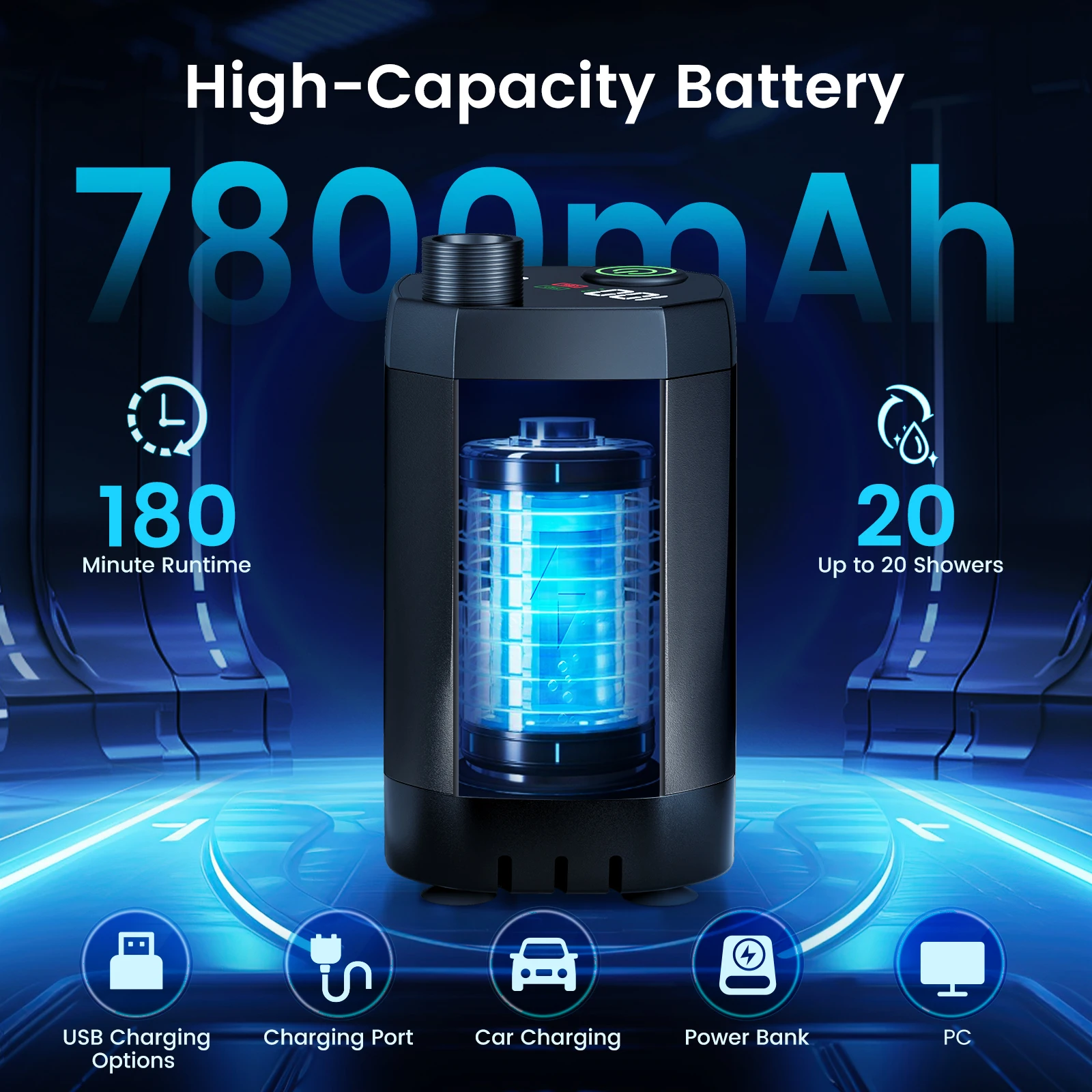 Plongez dans l’innovation avec notre pompe de douche rechargeable de 7800mAh. Conçue pour une autonomie prolongée, elle assure un débit d’eau constant pour des douches agréables même lors des séjours les plus longs. Son contrôle stepless vous permet d’ajuster le flux avec précision, économisant l’eau tout en vous offrant un confort sur mesure.