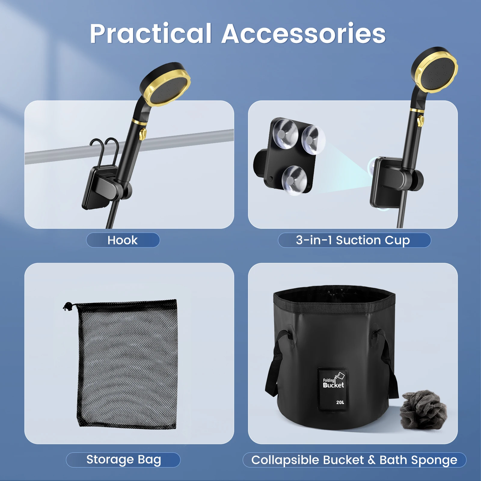 Profitez d’une hygiène impeccable partout avec cette douche de camping portable, dotée d’une pompe rechargeable puissante et d’un seau pliable de 20L, idéale pour toutes vos aventures en plein air.