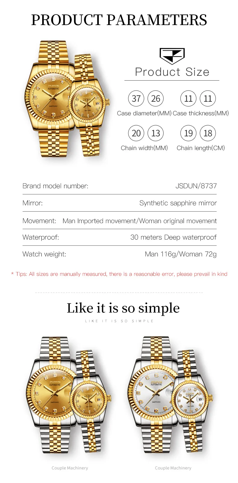 Offrez-vous ou offrez à votre couple l’élégance et la précision avec ces montres JSDUN automatiques, dotées d’un verre saphir inrayable et d’un design luxueux en acier inoxydable.