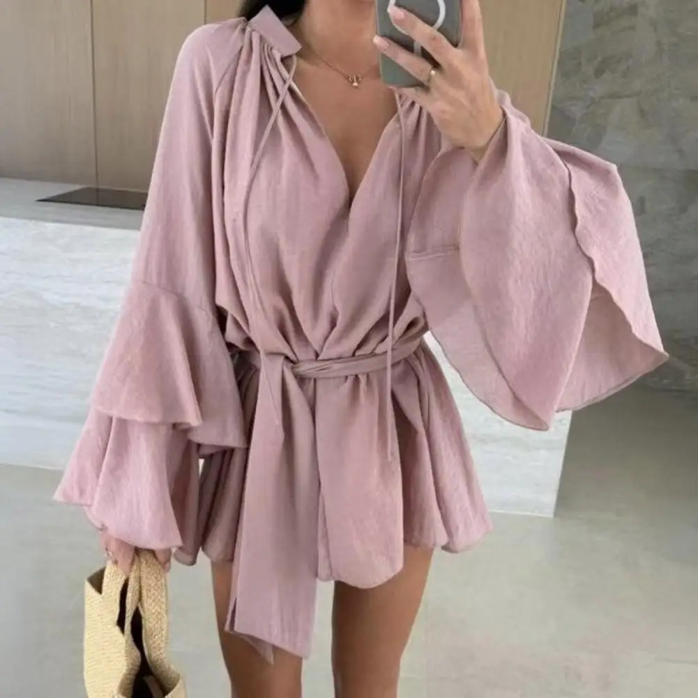 Robe Mini Femme Été Col V Volants Manches Longues – Élégance ChicRobe Mini Femme Été Col V Volants Manches Longues – Élégance Chic