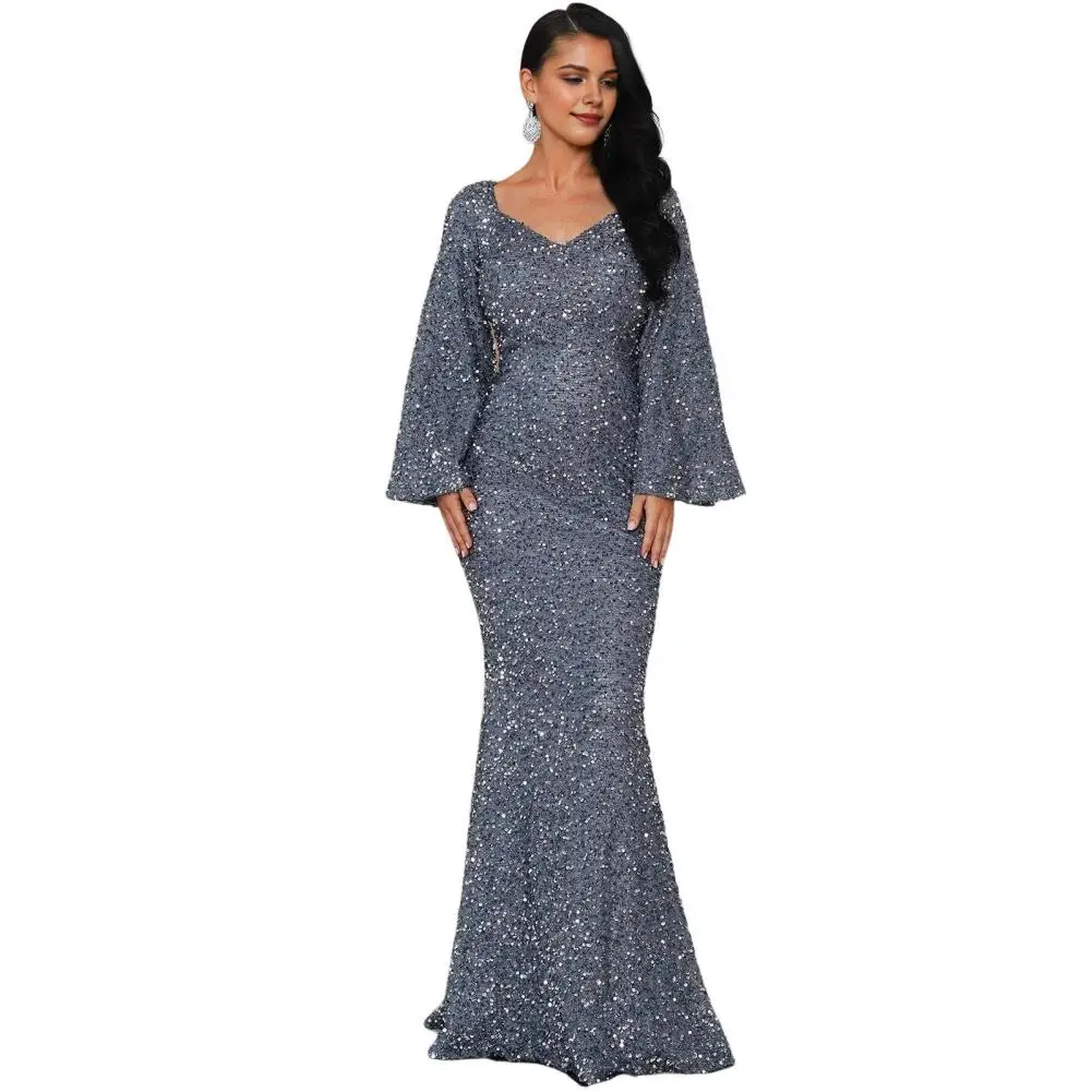 Robe de Soirée Scintillante Col V – Manches Cloche Élégante FemmeRobe de Soirée Scintillante Col V – Manches Cloche Élégante Femme