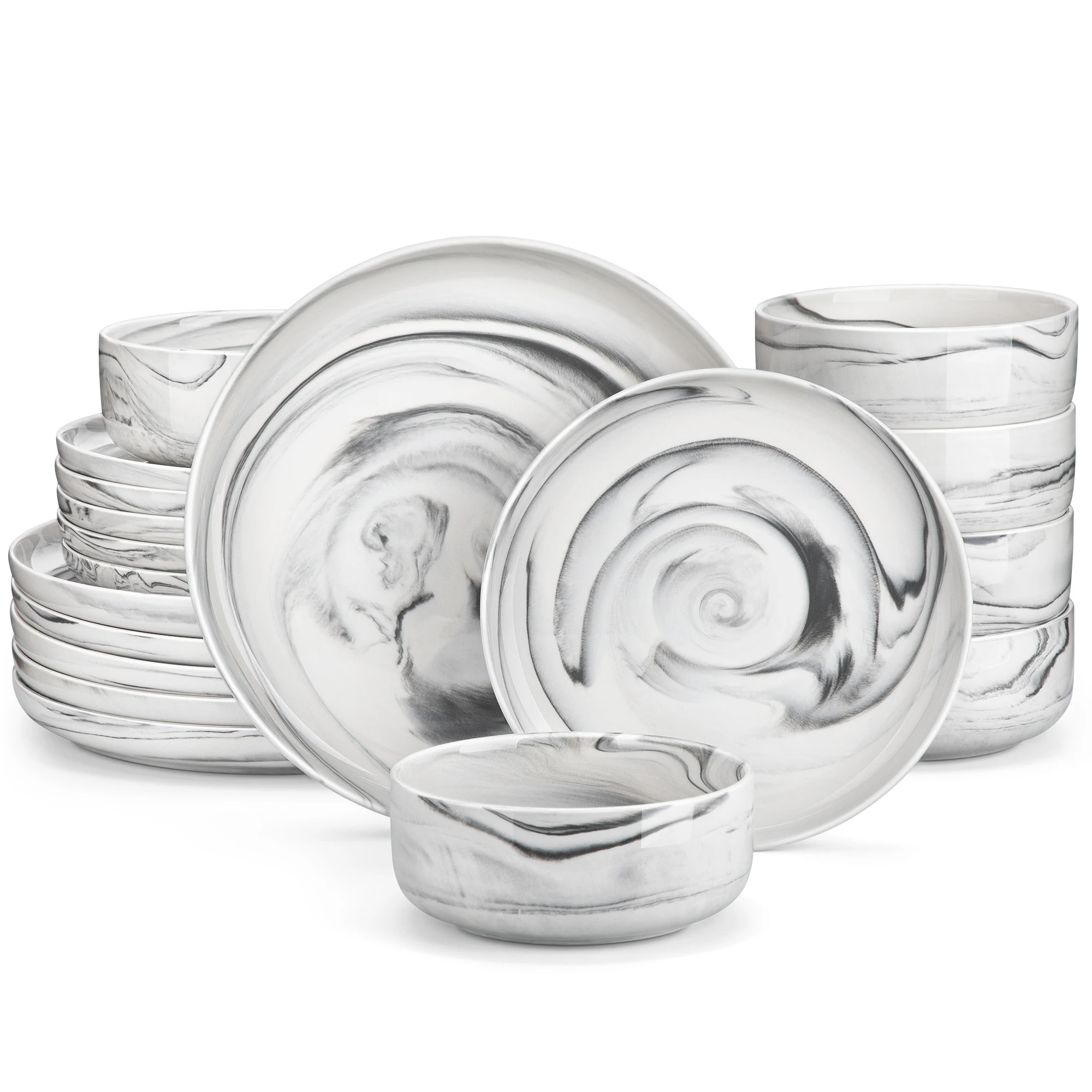 Un ensemble élégant de 18 pièces pour six personnes, incluant assiettes et bols assortis.