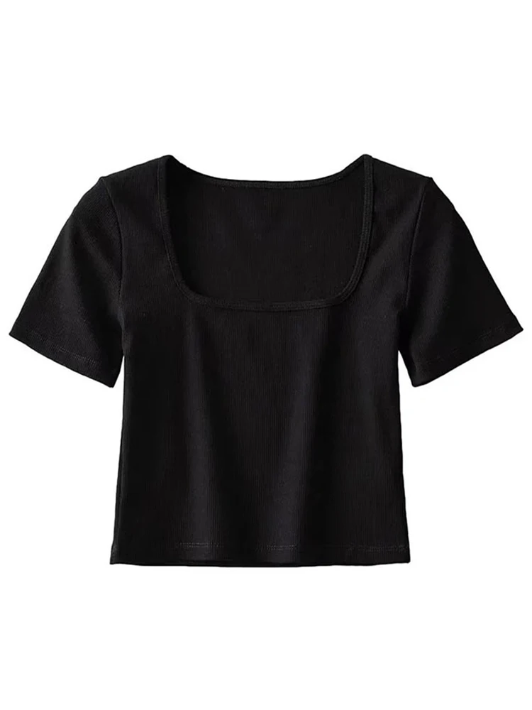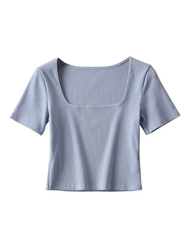 T-shirt Crop Top Côtelé Col Carré Femme – Manches Courtes ÉtéT-shirt Crop Top Côtelé Col Carré Femme – Manches Courtes Été