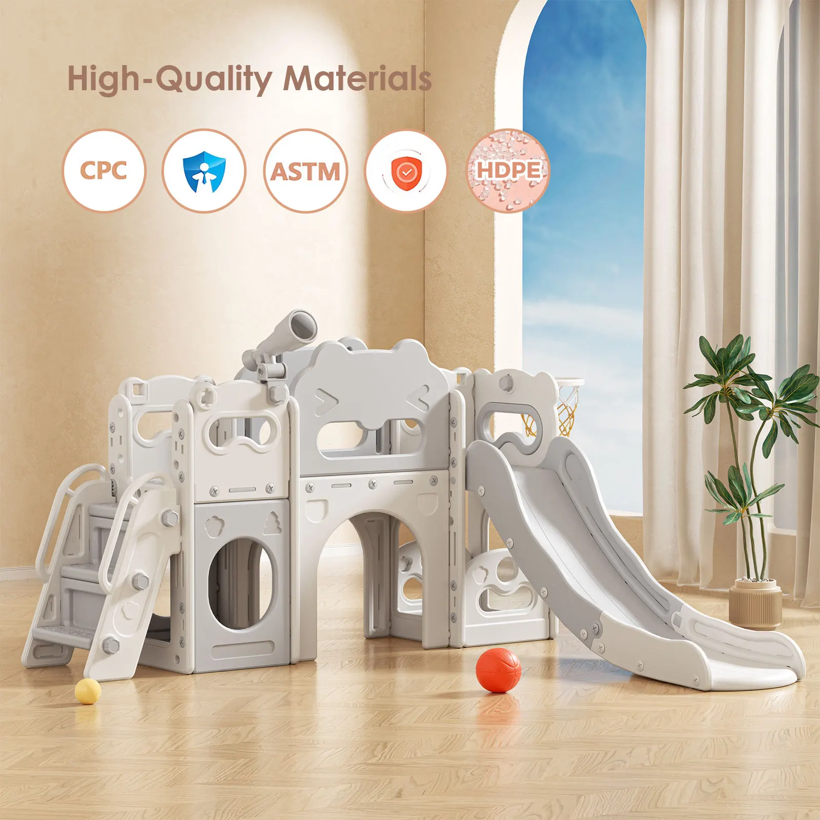 - Multifonction 7-en-1 : Toboggan, balançoire, escalade, tunnel, panier, télescope, rangement.