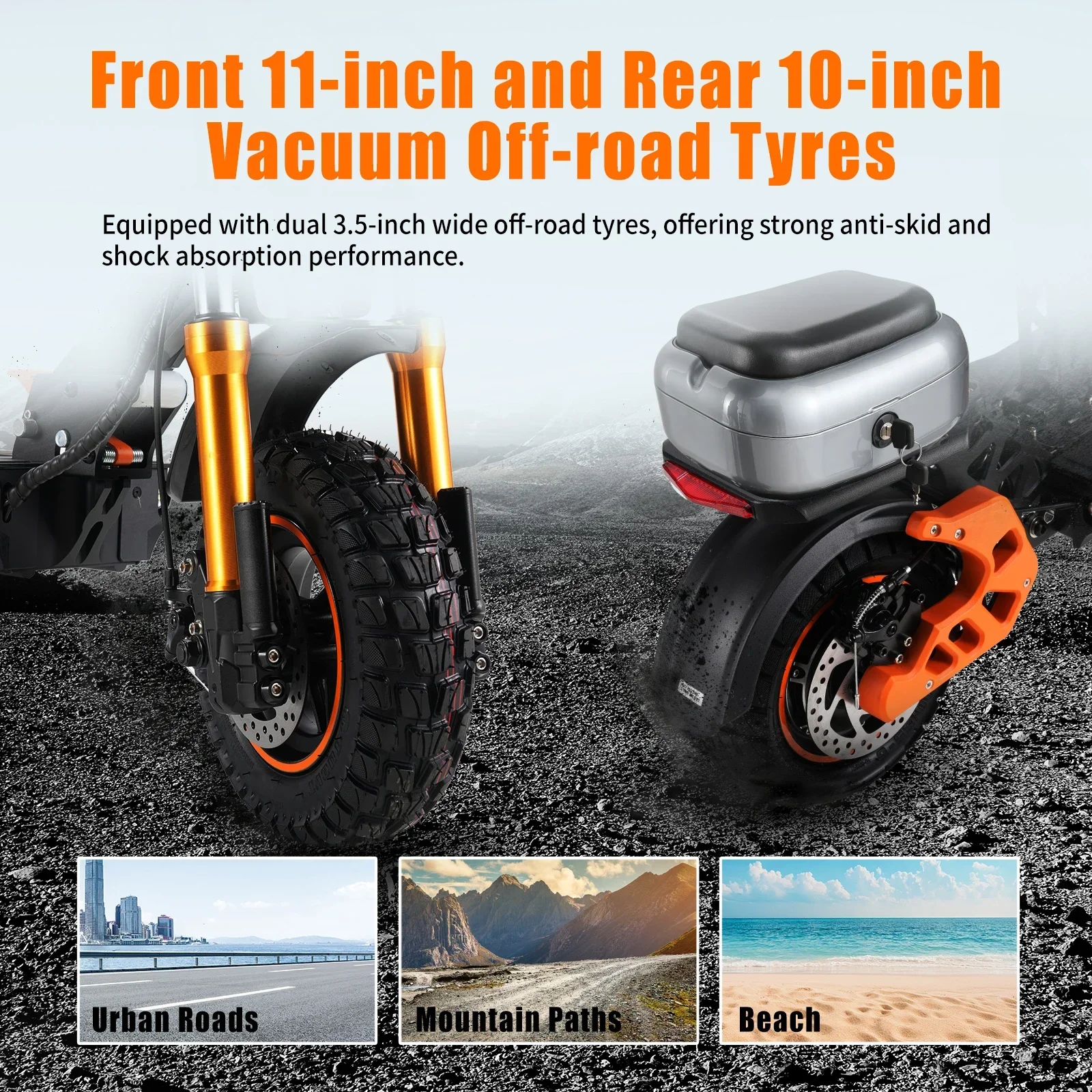 - Confort Absolu : Suspension complète et pneus tout-terrain 11″.