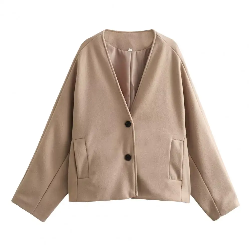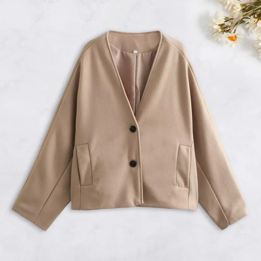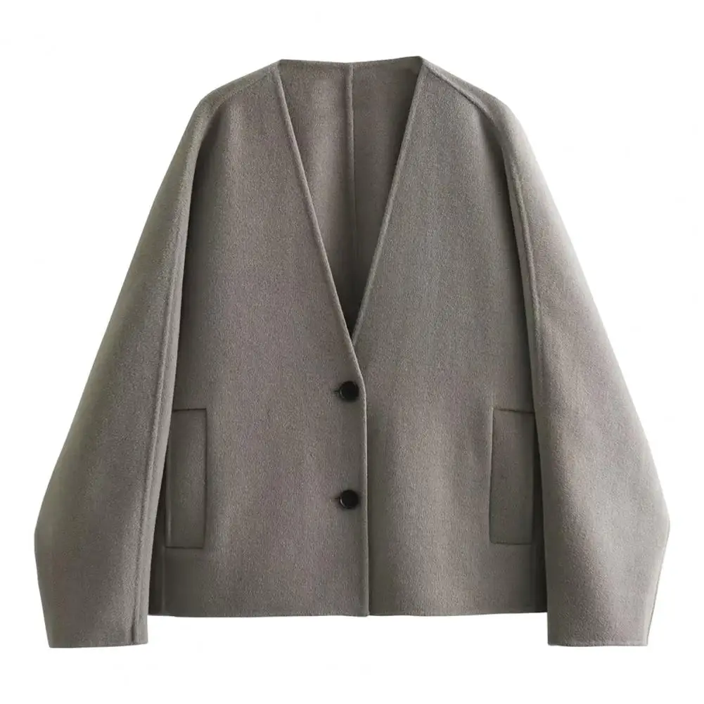 Son design ample à double boutonnage et son col en V confèrent une élégance discrète, facile à intégrer dans toute garde-robe moderne.